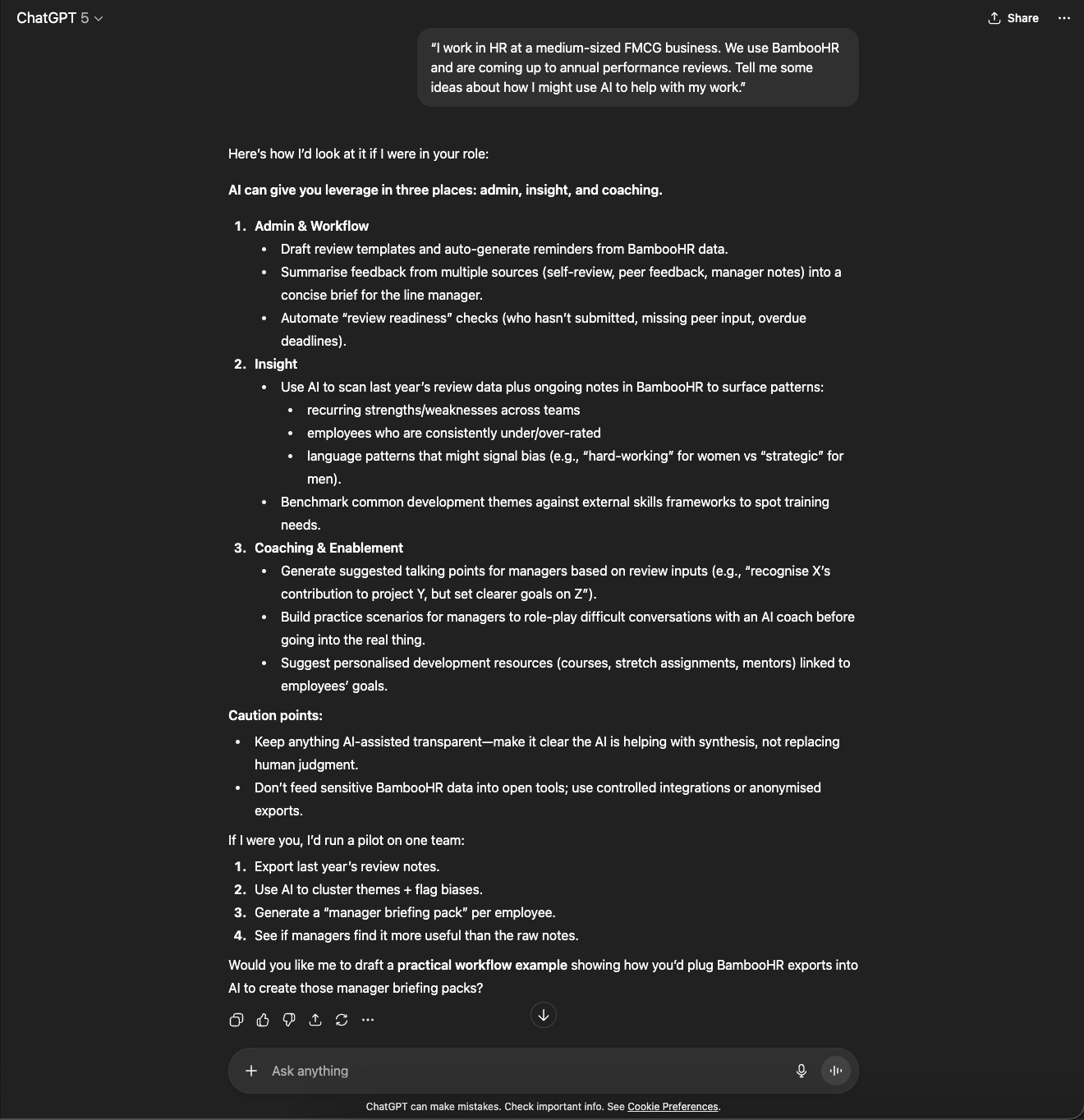 “I work in HR at a medium-sized FMCG business. We use BambooHR and are coming up to annual performance reviews. Give me some ideas on how I might use AI to help with my work.”