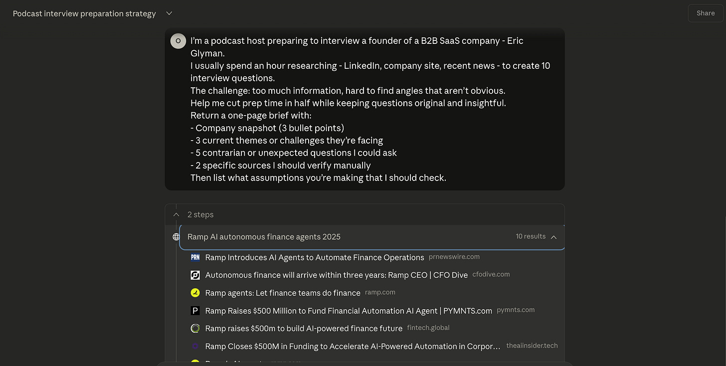 What I get back: structured brief with company context, intelligent questions I wouldn’t have thought of, and specific things to verify.